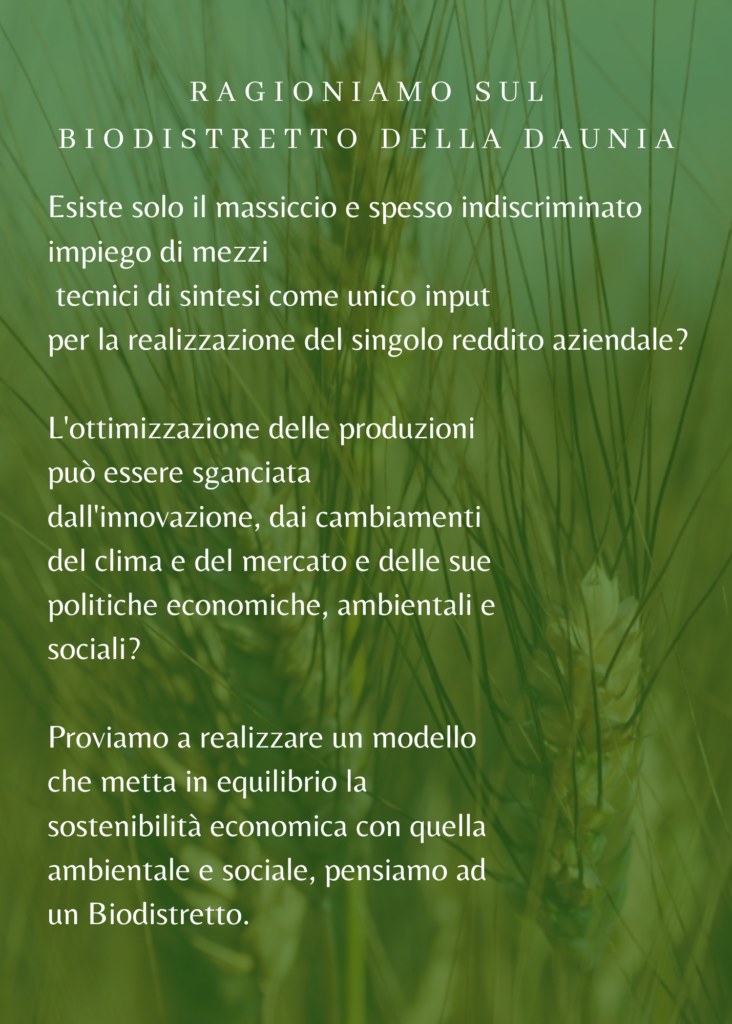 Il progetto nasce dalle esigenze concrete delle aziende biologiche del distretto produttivo della Daunia ma trova una propria e ulteriore ragione d’essere in questioni sociologiche e di ecologia del paesaggio legate ai principi dell’agricoltura biologica, rinforzati con il nuovo Reg. UE n. 2018/848. Da qui la definizione di un modello “biologico” in chiave distrettuale per perseguire lo sviluppo territoriale, la coesione e l’inclusione sociale, la tutela del lavoro e del rispetto dei diritti del lavoratore, salvaguardare il territorio e il paesaggio rurale attraverso le attività agricole ed agroalimentari biologiche.