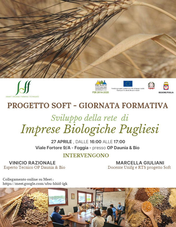 Terza giornata formativa per il #progetto #SOFT (Smart Organic Farming Tecniques) dedicato allo “Sviluppo della rete di Imprese Biologiche Pugliesi”- PSR 2014-2020 PUGLIA – Misura 16.2. L’appuntamento è per mercoledì 27 aprile 2022 alle ore 16.00 presso la sede della O.P. Daunia & Bio in Foggia – Viale Fortore, 9/A.